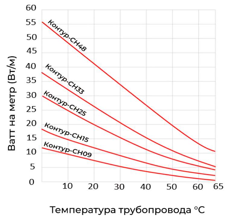 Удельная выходная мощность кабеля Контур-СН зависит от температуры окружающей среды и при понижении окружающей температуры и увеличении тепловых потерь через тепловую изоляцию оборудования выходная мощность кабеля повышается. И, наоборот, при повышении окружающей температуры и уменьшении тепловых потерь через тепловую изоляцию выходная мощность кабеля снижается. Возможность саморегулирования выходной мощности в зависимости от температуры позволяет избежать температурного повреждения кабеля и допускает наложение кабеля друг на друга при монтаже.